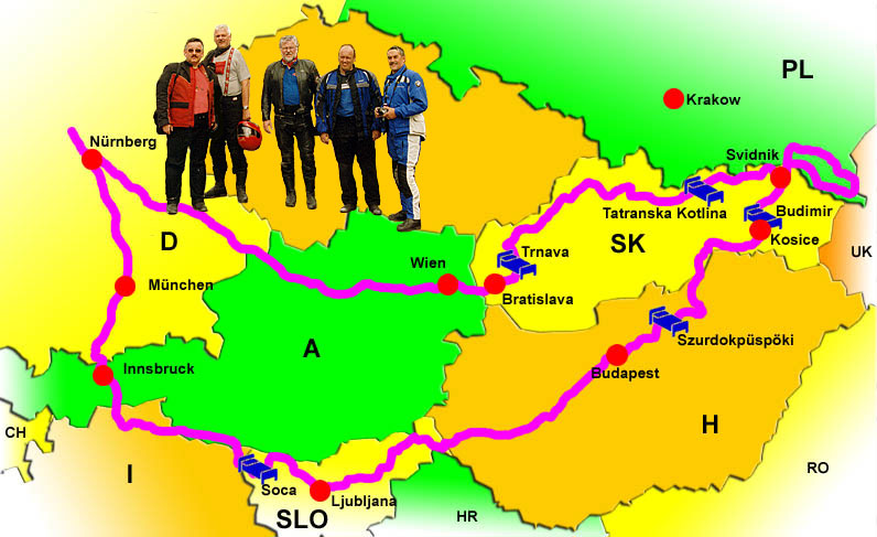 So legten wir diese Ausarbeitung mit einigen Infos auf die Homepage und warteten auf die Resonanz. Mhhh. Die war nicht so überwältigend. Alle hatte scheinbar die Toscana -Tour vom letzten Jahr in Erinnerung und der Osten Europas schien nicht diesen Reiz auszuüben. Jedenfalls zum Meldeschluss blieben nur wir fünf übrig. Auch nicht weiter tragisch. Aber es wird gefahren und dabei bleibt es. Gut. Beim Abfahrt-Termin gab's noch ´ne kleine Korrektur, sonst alles paletti.