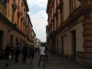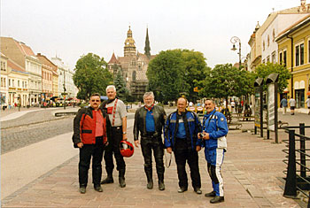 Die paar Kilometer nach Kosice waren schnell zurückgelegt, und Marian dirigierte uns auf einen Parkplatz im Stadtzentrum. Unser Gepäck konnten wir im Wachhäuschen des Parkplatzwächters unterbringen. So mussten wir das Zeug wenigstens nicht mit uns rumschleppen. Es war schwül an diesem Tag, oder es fehlte der sonst gewohnte Fahrtwind. Der Dampf in den Klamotten war fast unerträglich. Doch für ein Einstiegsfoto stellten sich alle ohne mit der Wimper zu zucken in Positur. |