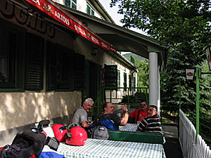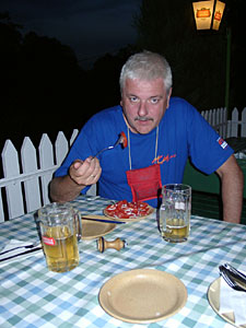 | Nach den Restaurationsarbeiten, sprich Duschen und Umziehen, stand das Abendessen auf dem Programm. Die Verständigung funktionierte hier nicht ganz so problemlos, doch jeder hatte was zum Essen bekommen. Lag vielleicht an den vielen "Ös" und "Zs". Dirk gönnte sich erst einen Tomatensalat -- soll ja gut für die Augen sein -- und für die weiteren Gespräche über die Aktiengeschäfte und Kapitalanlagen. | ![]() |