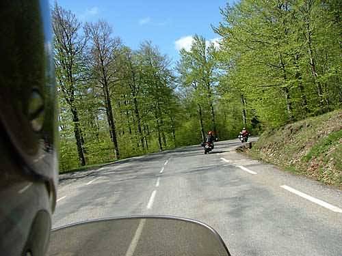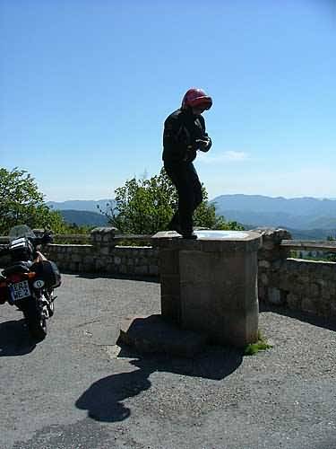 Die höchste Stelle erreichen wir am Mont Aigoual mit knapp 1600m. Der Wind bläst wie Hölle. Wir drehen die Moppeds lieber mit der schmalen Seite in den Wind. Eine Böe auf die Breitseite und das Ding könnte umfliegen. Das Thermometer meiner Pan zeigt eisige drei Grad! Bibber! Bibber!