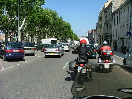 Dirk trauert schon den ganzen Tag seinem Reifenprofil nach, das zusehends verschwindet. Die Heimfahrt führt in der Nähe Carcassonnes vorbei. Es bestünde die Chance, hier dann einen neuen Satz aufziehen zu lassen. Also biegen wir gleich bei den ersten Häusern von Carcassonne rechts in ein Gewerbegebiet ein. Tatsächlich finden wir einen Reifenhändler. Nach einigem Chaos mit dem gegenseitigen Verständnis erfahren wir, dass es in diesem Außenlager keine Motorradreifen gibt, sondern nur im Geschäft in der Stadt. "Wie kommen wir dahin?", stellt sich sogleich die Frage. Da schickt einer den Jüngsten der Truppe als Guide mit seinem Roller voraus.