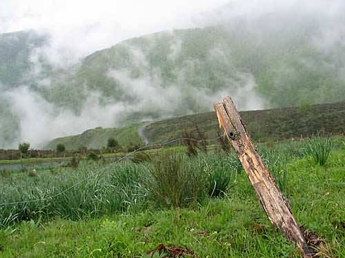 Je tiefer wir kommen, desto schlimmer wird es. Über uns ist die Nebelschicht inzwischen so dick, dass es nicht nur mehr nieselt, sondern richtig regnet. Sicht gleich Null. In einer Fahrzeugschlange rollen wir bergab. Hin und wieder überholen ein paar einzelne Wahnsinnige. |