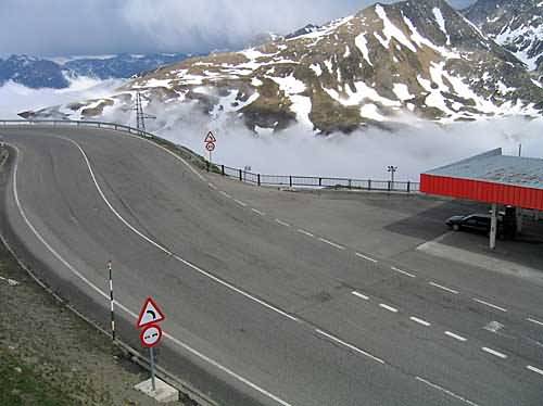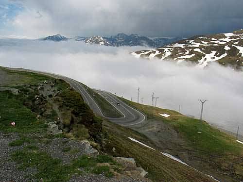 Bei schönem Wetter verlassen wir die Stadt Andorra und freuen uns noch über die gegen Deutschland um 40 Cent billigeren Spritpreise. Die Envalira hoch zeigen sich am Himmel erste dunkle Wolken. Aha, die Grenze naht. Wir fahren höher und höher. An der Passhöhe zeigt das GPS schließlich 2422 m über NN! Der Blick hinunter nach Frankreich: fantastisch! Wir stehen über den Wolken, die grellweiße Nebelbank beginnt so zwei bis drei Kehren unter uns und reicht so weit das Auge reicht. Aus der Watte heraus ragen nur noch die höchsten Gipfel und leuchten in der Nachmittagssonne.