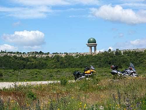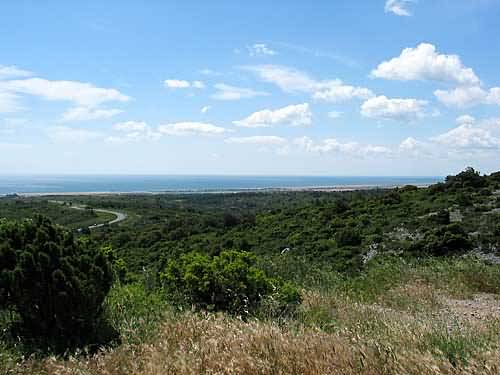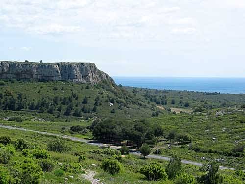 Für fahren ein sehr schönes Sträßchen, das in einen Pinienwald führt. Der Duft steigt schon sehr stark in die Nase. Wie wir den Wald auf einem Plateau verlassen, haben wir einen tollen Blick aufs Mittelmeer. Der Wind bläst höllisch. |