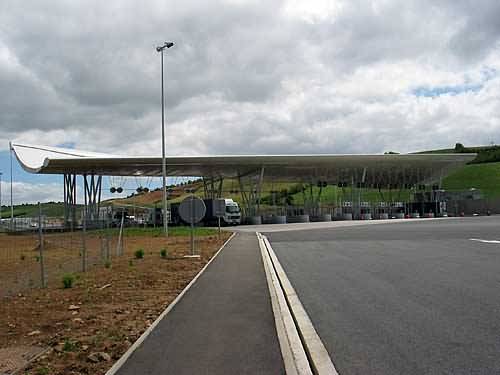 Die zur Brücke gehörende Mautstelle. Man beachte das verwundene Dach! |