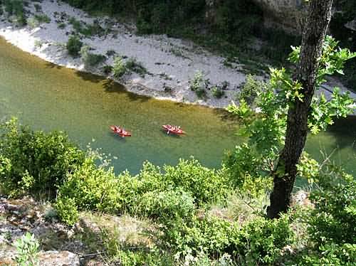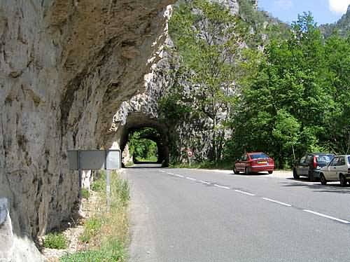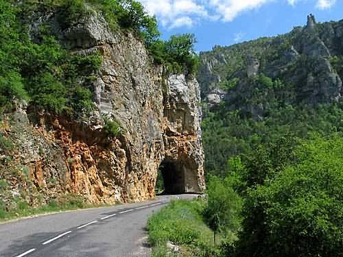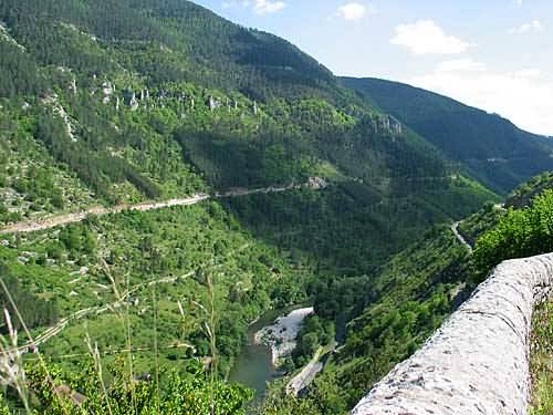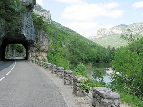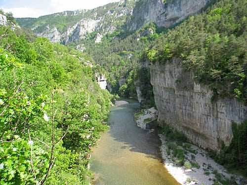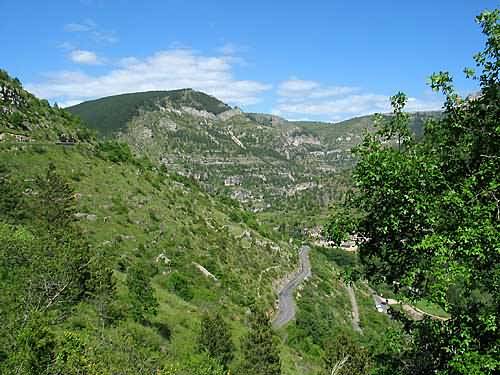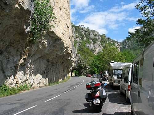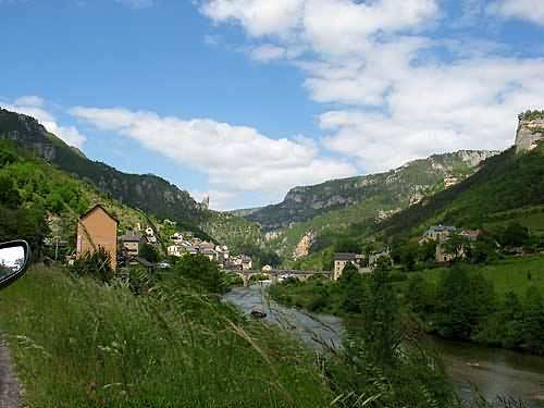 Wir nehmen die zweite Ausfahrt nach der Maustelle und erreichen die Tarn bei Aguessac. Anfangs noch recht breit, gerät man immer weiter in eine enge Schlucht, an deren Hang die kleine Strasse entlang führt. Landschaftlich sehr hübsch, fahrerisch eher wenig aufgrund des starken Verkehrs. Untern Strich finde ich das Ardeche-Tal ansprechender. Romantischer ist jedoch die Tarn-Schlucht. |